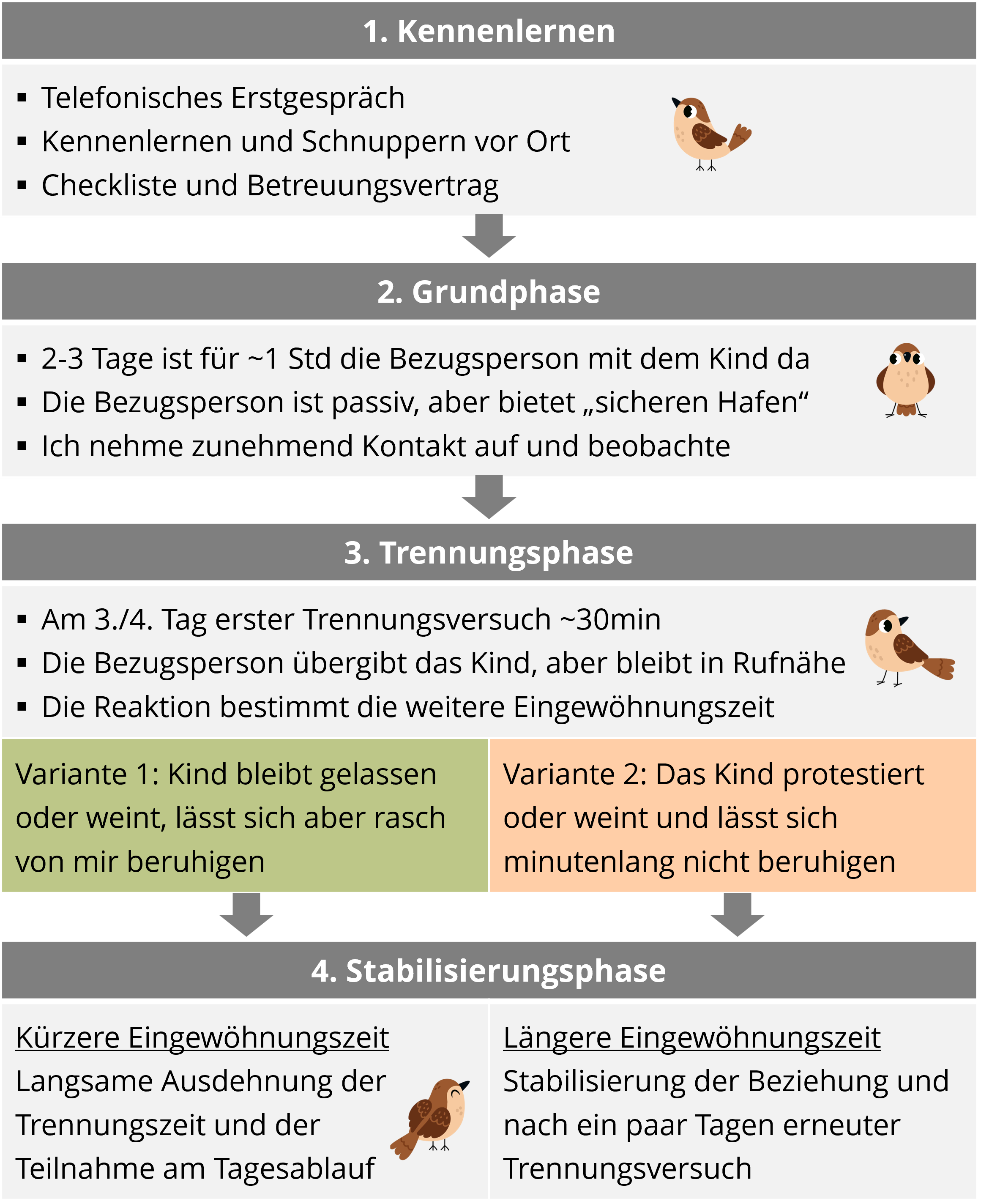 Für eine sanfte Eingewöhnung orientiere ich mich, wie die allermeisten Kitas und Krippen, am Berliner Modell. Die typischen Phasen sind in der Abbildung dargestellt.